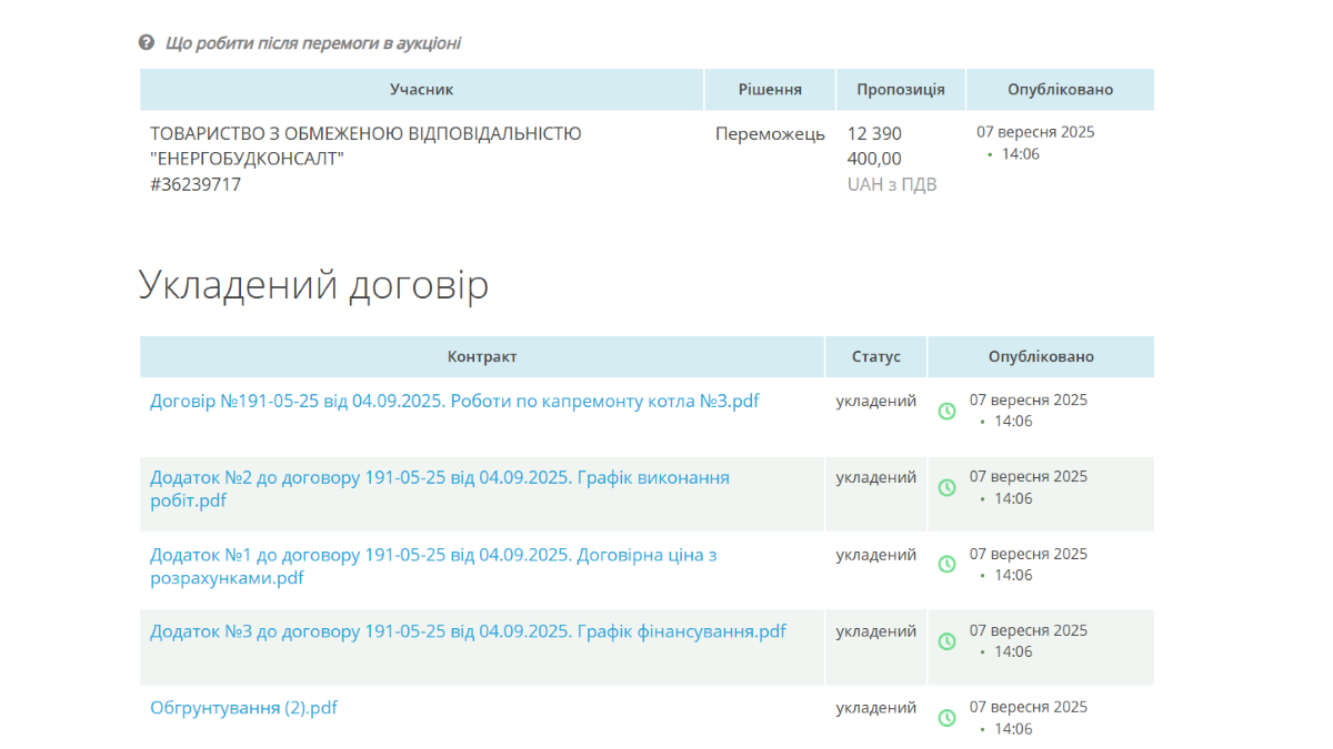 В 2025 году общество "Энергостройконсалт" уже получила контракты от КП "Харьковские тепловые сети" и ГКП "Херсонтеплоэнерго" на более 50 миллионов гривен. Только в июле общество выиграло подряды на ремонт двух водогрейных котлов в Херсоне стоимостью более 40 миллионов гривен. Как и нынешняя закупка, они состоялись без реальной конкуренции и с символическим снижением цены.