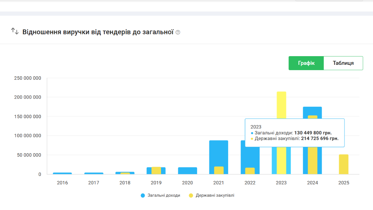 По данным YouControl, с 2018 года компания получила государственных подрядов на более 474 миллионов гривен. Самый большой доход был в 2023 году, он составил более 214 миллионов, а главным заказчиком выступало КП "Харьковские тепловые сети". У фирмы есть две лицензии - на строительство объектов архитектуры и производство промышленного оборудования.