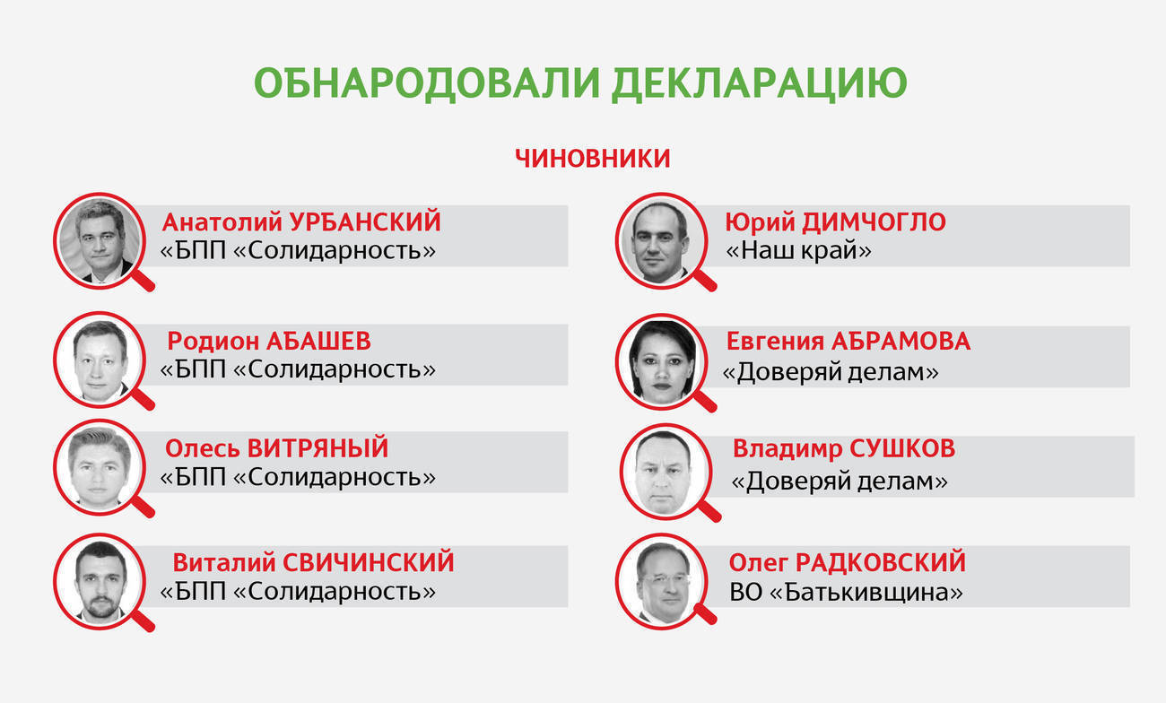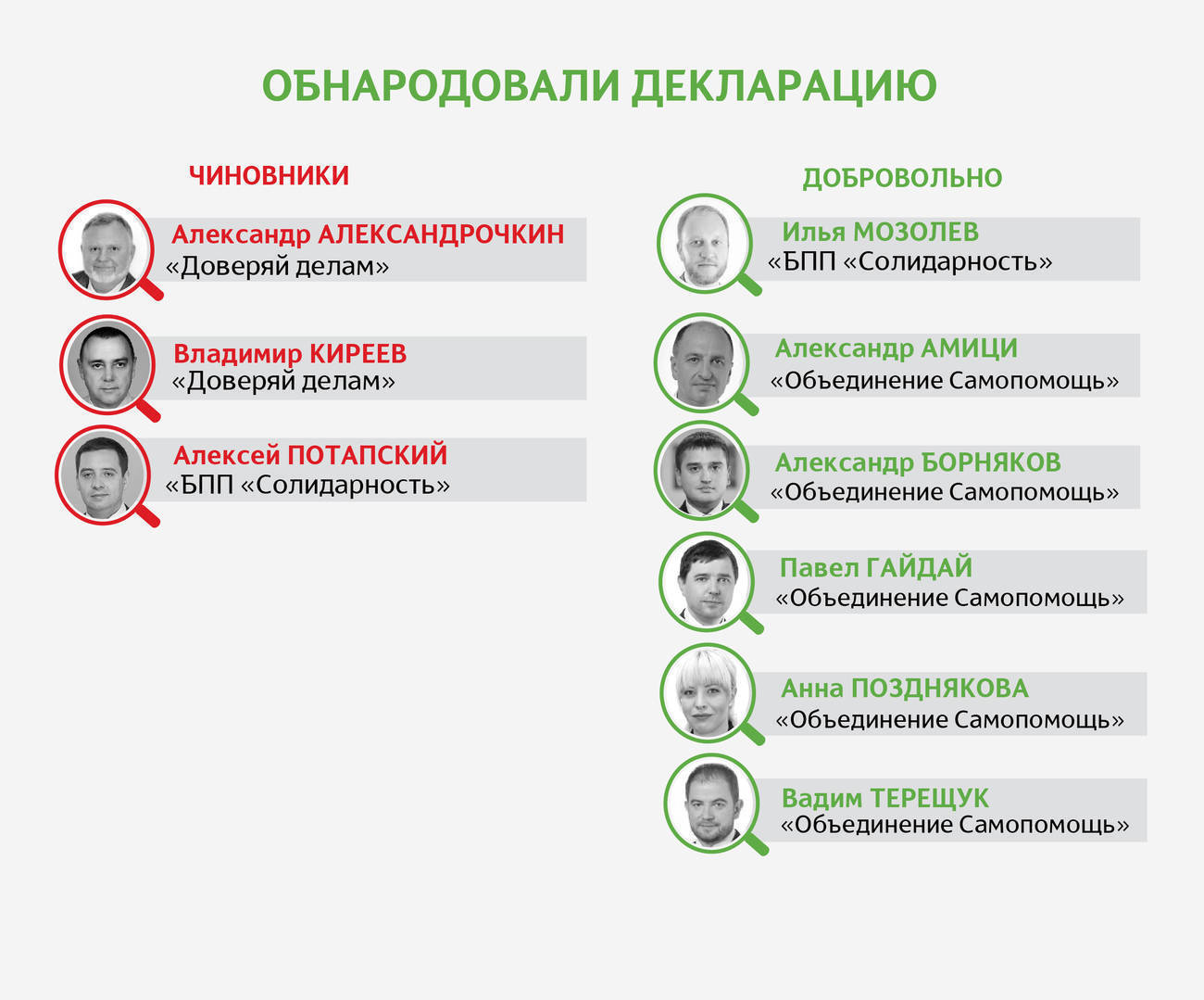 Добровольно обнародовали декларации все депутаты, представляющие Объединение Самопомощь: Александр Амицы, Александр Борняков, Павел Гайдай, Анна Позднякова и Вадим Терещук, а также Илья Мозолев – представляющий Блок Петра Порошенко «Солидарность».