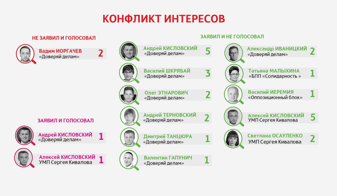В тоже время, значительная часть депутатов надлежащим образом исполнила требования закона, заявив о наличии конфликта интересов и не приняв участие в голосовании: Василий Шкрябай, Олег Этнарович, Андрей Терновский, Дмитрий Танцюра, Валентин Гапунич, Александр Иваницкий и опять же, Андрей Кисловский (все Доверяй Делам), Татьяна Малыхина (БПП «Солидарность»), Василий Иеремия (Оппозиционный блок) и опять Алексей Кисловский (Украинская морская партия С. Кивалова).
