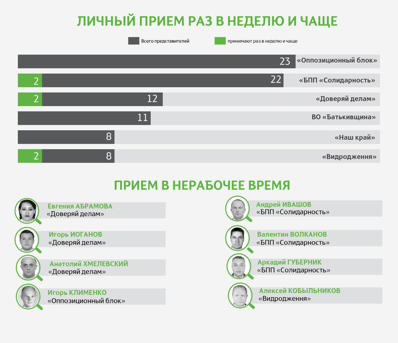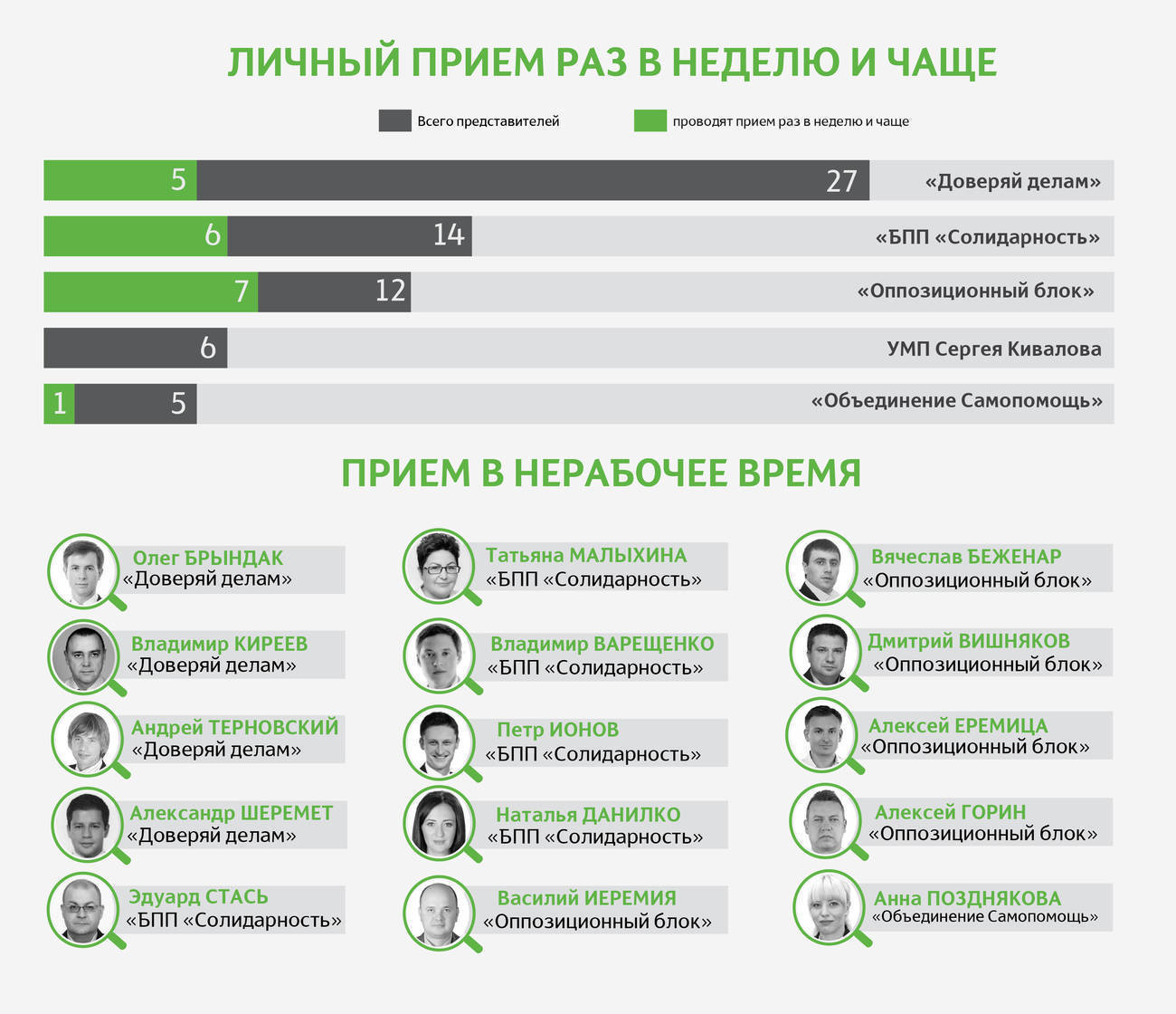 При этом лишь незначительная часть депутатов, как областного совета, так и Одесского городского проводит прием избирателей в выходные дни, либо в нерабочее время в будние дни, что значительно упрощает доступ для избирателей к приемным своих депутатов.