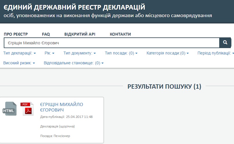 Причем декларацию Михаила Егрищина найти удалось не сразу из-за несовпадения написания фамилии на украинском языке на сайтах городского совета и НАПК.