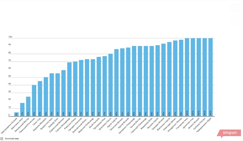 Самую худшую посещаемость комиссий продемонстрировала Наталья Завгороднюк ("БПП «Солидарность») – лишь 5%.