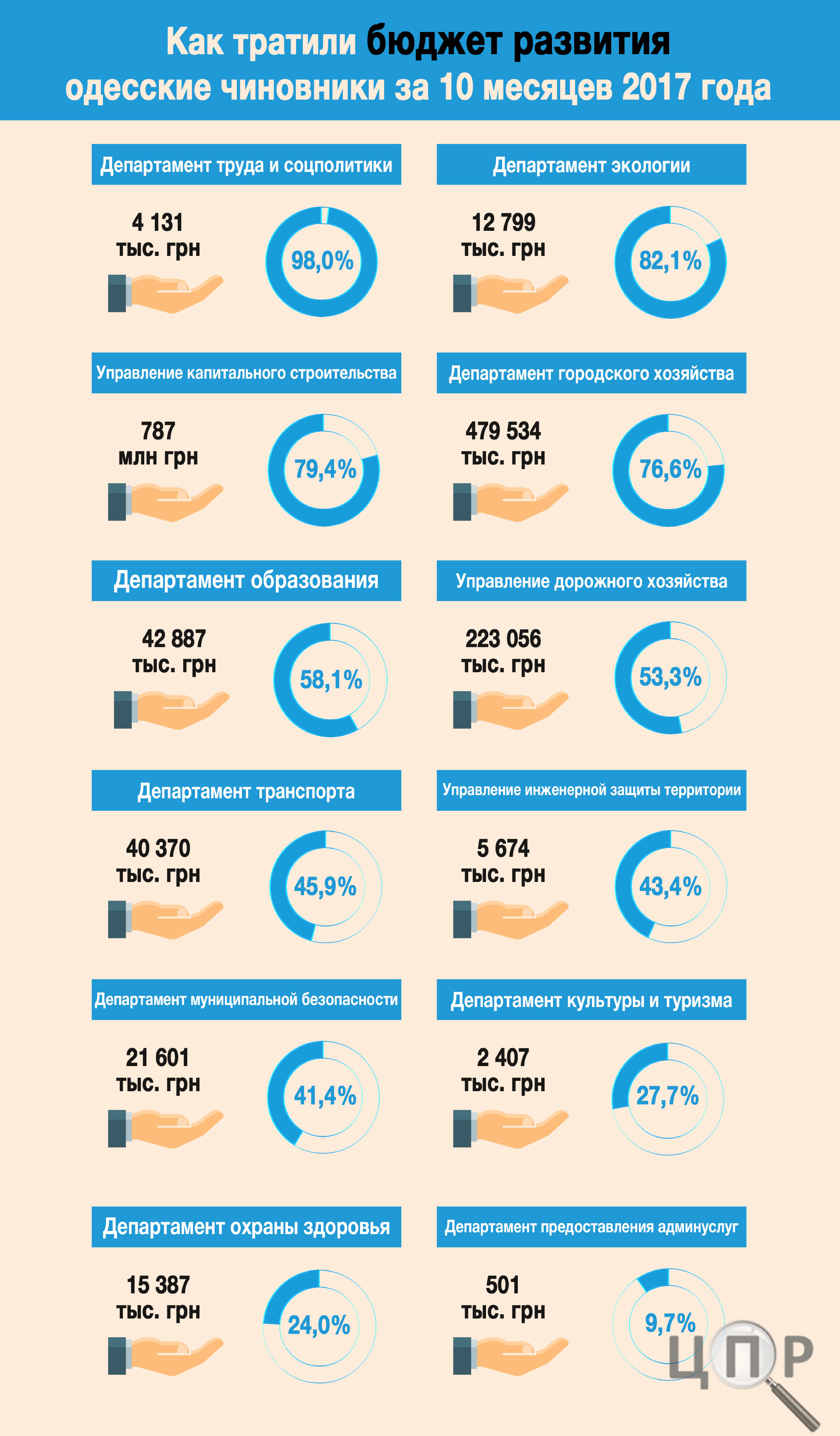 Динамика выполнения программ остальными подразделениями указана в инфографике. Отметим, что лучше всех из крупных расходов бюджета развития справились в департаменте экологии - 82,1%, или 12 миллионов 799 тысяч гривень и департаменте труда и соцполитики - 98%, или 4 миллиона 131 тысяча гривень. А вот самые низкие темпы - у департамента предоставления админуслуг - 9,7%, или 501 тысяча гривень, департамента здравоохранения - 24%, или 15 миллионов 387 тысяч гривень и департамента культуры и туризма – 27,7%, или 2 миллиона 407 тысяч гривень.