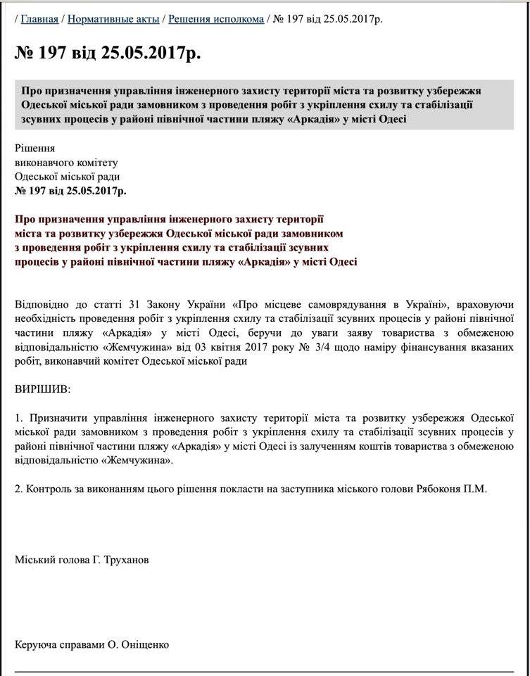 Напомним, что ранее решением исполкома управление инженерной защиты было назначено заказчиком работ по укреплению склона и стабилизации оползневых процессов в районе северной части пляжа Аркадия. При этом управлению разрешат привлечь на эти нужды средства общества с ограниченной ответственностью «Жемчужина».