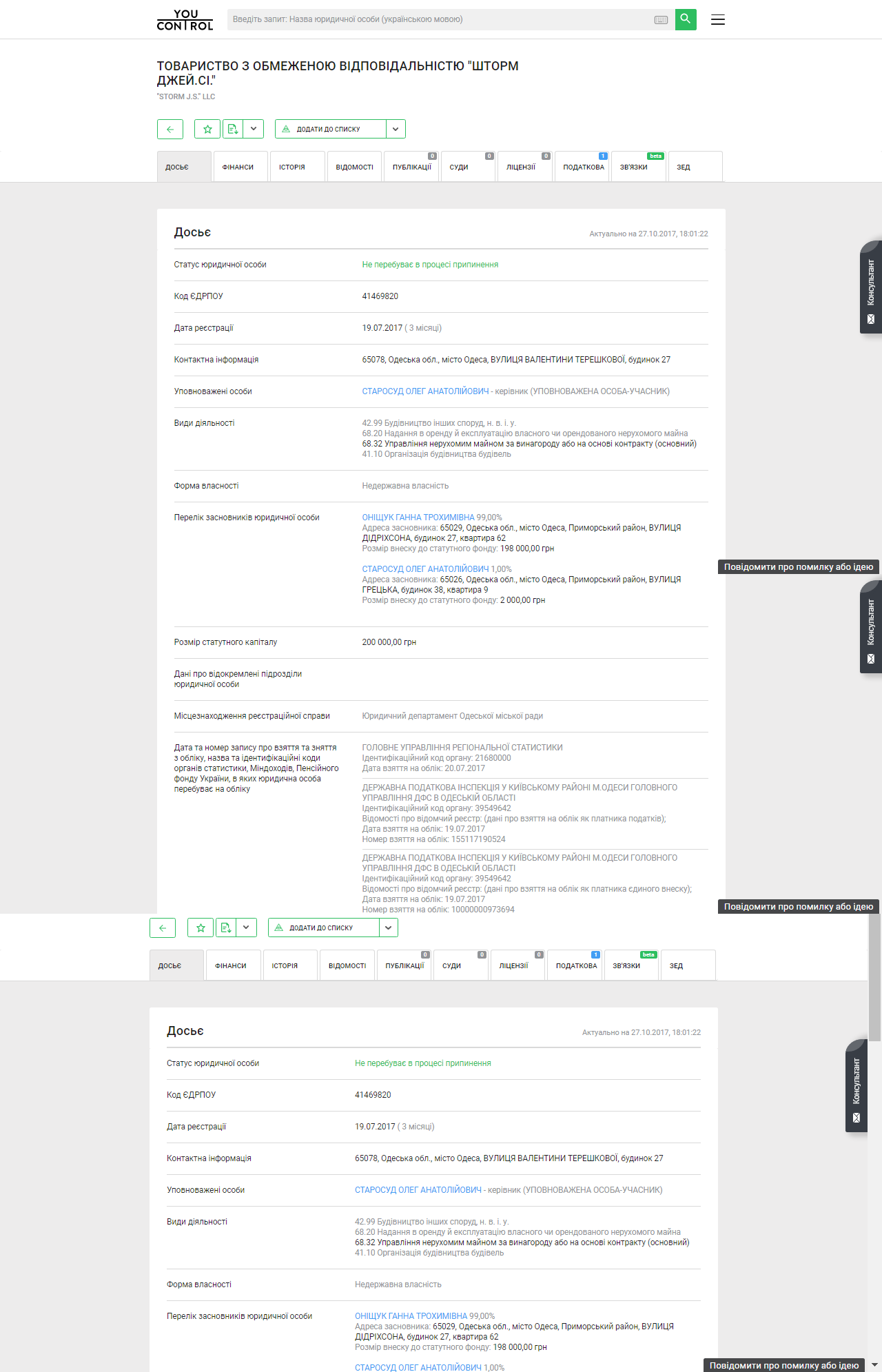 Учредителями компании «Шторм Джей. Си.» являются Анна Онищук и Олег Старосуд.