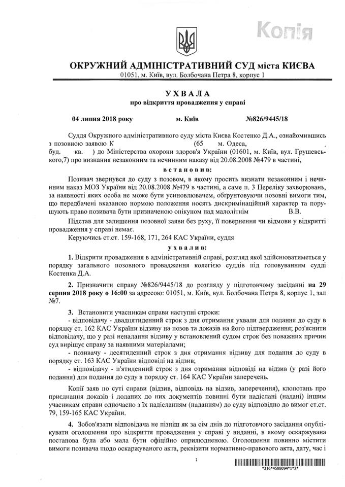 Окружной административный суд. Киева открыл производство по иску к Министерству здравоохранения Украины о признании незаконным и недействительным Перечня заболеваний, при наличии которых лицо не может быть усыновителем или опекуном
