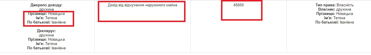 Кроме того, его супруга Татьяна Новацкая продала квартиру за 45 тыс. 600 грн. Впрочем, в прошлогодней декларации никакой квартиры на ее имя не значилось, тогда как, наоборот, за В. Новацким числились две квартиры: площадью 165,3 кв. м. в Южном и площадью 162 кв. м в Одессе (первая приобретена в 2008 году, вторая – еще в 2002 году). В новой декларации одесской квартиры уже нет. Впрочем, предположить, что недвижимость площадью 162 квадрата в Одессе можно продать за 45,6 тыс. грн, довольно сложно.