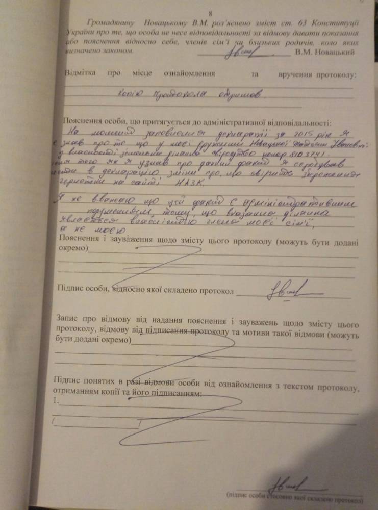 «Исчезли» из новой декларации мэра и 20 тыс. кв. метров земли в селе Еремеевке Раздельнянского района. Этот участок числился за Татьяной Новацкой и был приобретен в августе 2013 года. Более того, весной 2017 года органами полиции на Владимира Новацкого был составлен админпротокол в связи с тем, что он не указал в электронной декларации за 2015 год этот земельный участок своей супруги Татьяны. В протоколе о коррупции мэр заявил, что не знал об участке.