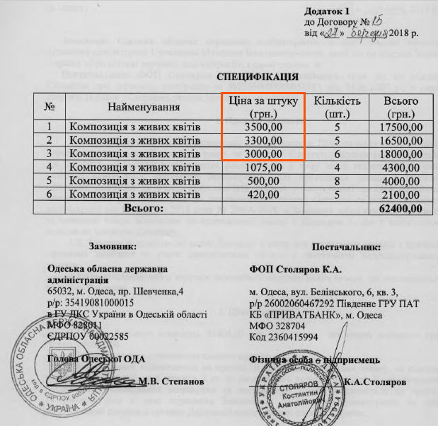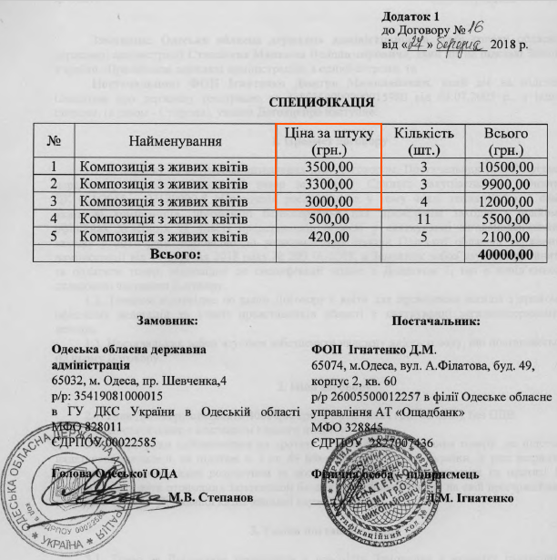 Одесская ОГА в лице ее главы Максима Степанова заключила с ФЛП Столяровым Константином Анатольевичем договор на поставку 33 штук цветочных композиций стоимостью 62 тыс. 400 грн. Среди них есть очень дорогие: 5 композиций по 3500 грн, пять - по 3300 грн и шесть - по 3000 грн, - передает Центр публичных расследований.