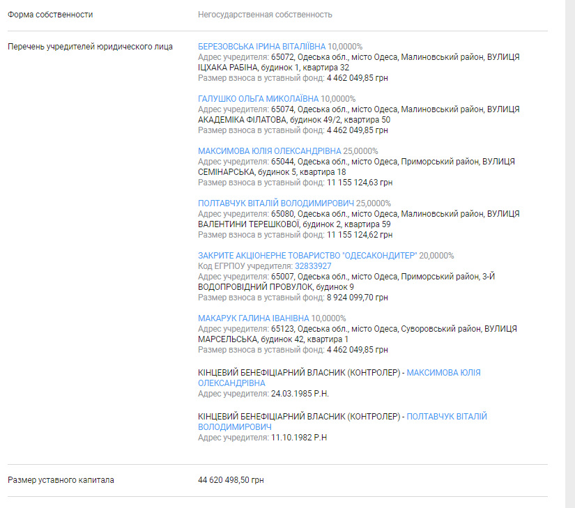 «Вместе с тем, согласно информационной справки Государственного реестра прав на недвижимое имущество и Реестра прав собственности на недвижимое имущество №87262172 от 17.05.2017 г., право собственности на нежилые здания детского оздоровительного лагеря «Космос», общей площадью 1659,6 кв.м. по адресу: Одесская область, город Одесса, улица Авдеева-Черноморского, 7, зарегистрировано за ООО «Амберелитбуд» (ЕГРПОУ 41143173, г.. Одесса, ул. Авдеева-Черноморского, 7) путем внесения ЗАО «Одессакондитер» доли в уставный фонд созданного общества», - пишется в материалах определения суда.