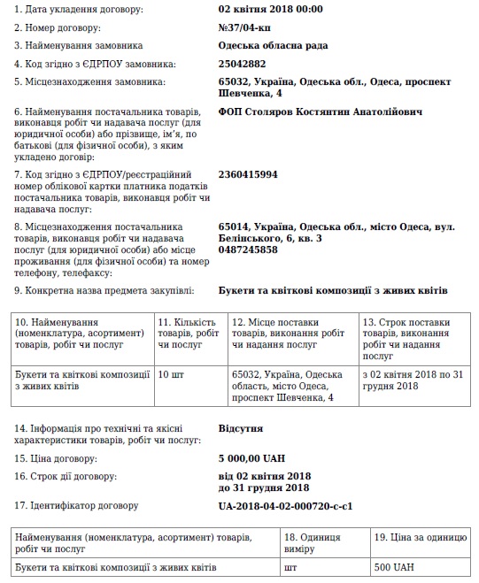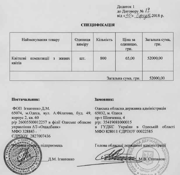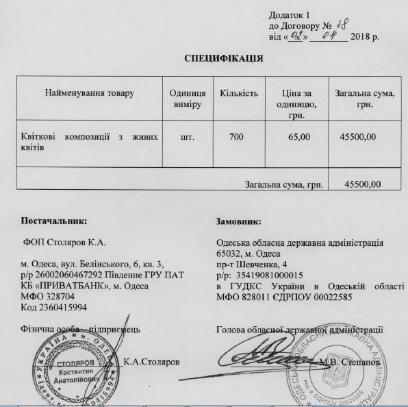 Всего за три месяца 2018 года глава Одесской облгосадминистрации Максим Степанов подписал четыре договора о поставке цветов на 199 тысяч 900 гривень.