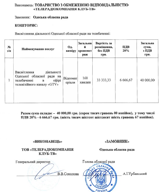 Кроме того, 20 марта Одесский областной совет подписал договор об освещении своей деятельности с телеканалом G-TV на 40 тысяч гривень в течение 160 минут эфирного времени. Ранее, в начале марта, областной совет заключил сделку с четырьмя телеканалами на сумму 159 тыс. грн.