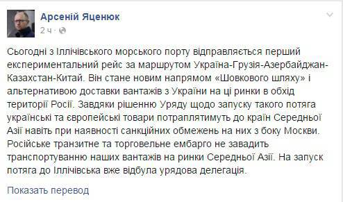 «Благодаря решению Правительства о запуске такого поезда украинские и европейские товары будут попадать в страны Средней Азии даже при наличии санкционных ограничений на них со стороны Москвы. Российское транзитное и торговое эмбарго не помешает транспортировке наших грузов на рынки Средней Азии. На запуск поезда в Ильичевск уже отбыла правительственная делегация», - написал Арсений Яценюк.