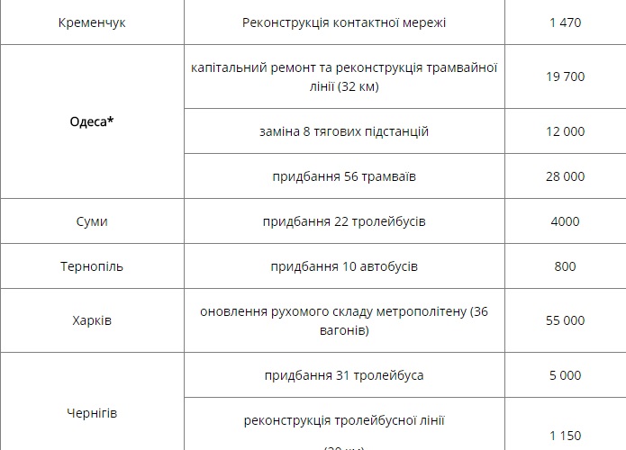 В рамках проекта Одесса может рассчитывать на получение 19 миллионов 700 тысяч евро на капитальный ремонт и реконструкцию трамвайных линий, 12 миллионов на замену восьми тяговых подстанций и 28 миллионов на приобретение 56 трамваев. При этом проект города Одессы планируется софинансировать совместно с ЕБРР под государственные гарантии, а ЕБРР планирует выделить 8 миллионов на покупку 40 троллейбусов.