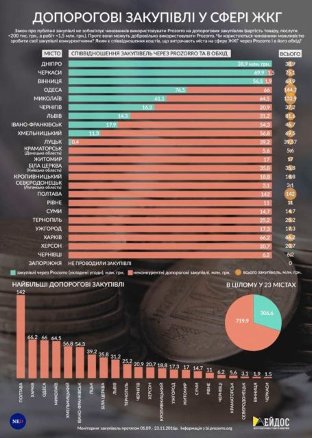 Согласно данным мониторинга, из 144 миллионов 700 тысяч гривень, потраченных одесскими властями на закупки в сфере жилищно-коммунального хозяйства в течение августа-ноября 2016 года, 66 миллионов потрачены на допороговые закупки и 76,5 миллионов через «Рrozorro».