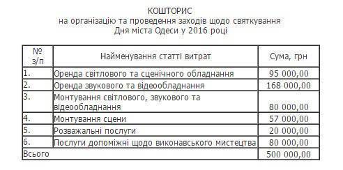 Согласно документу, праздничные мероприятия обошлись городской казне в 500 тысяч гривень.