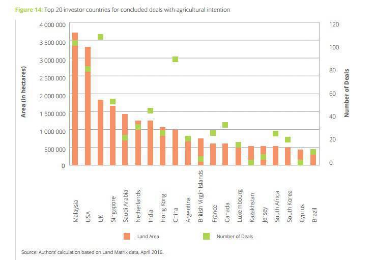 В целом, согласно отчету Land Matrix, начиная с 2000 года, 26,7 млн гектар сельскохозяйственных земель всего мира перешло под контроль иностранных инвесторов. Это означает, что инвесторы владеют примерно 2 процентами пахотных земель во всем мире на площади, примерно равной общей территории Великобритании и Словении вместе взятых.