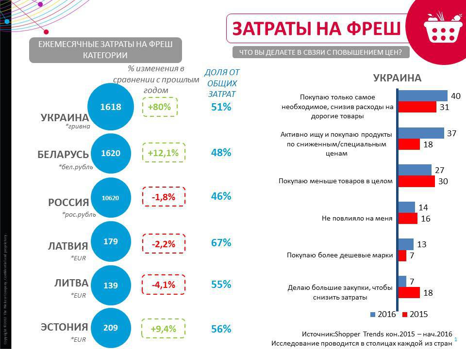 После падения затрат на свежие продукты в 2015 году на 26%, в 2016 году их доля в общих ежемесячных затратах составила целых 51%, в то время как в Беларуси, например 48%, а в России всего 46%.