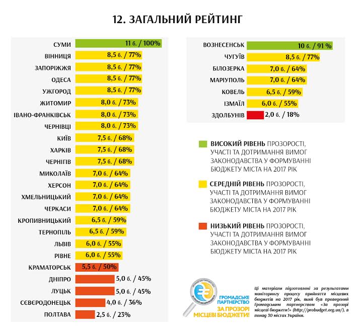 Соответственно, из 31 города, охваченного мониторингом, только в Сумах бюджетный процесс был организован на должном уровне, что означает не только соблюдение формальных требований законодательства, но и высокий уровень привлечения общественности. На один балл от Сум отстает Вознесенск, поскольку там городской совет ограничился только проведением электронных консультаций и не использовал другие форматы публичных консультаций по проекту бюджета на 2017 год с гражданами.