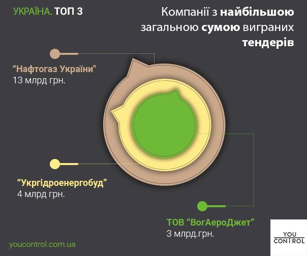 Абсолютным лидером, по данным YouControl, выигравшим тендеры на общую сумму почти 13 миллиардов гривень является НАК «Нафтогаз Украины».