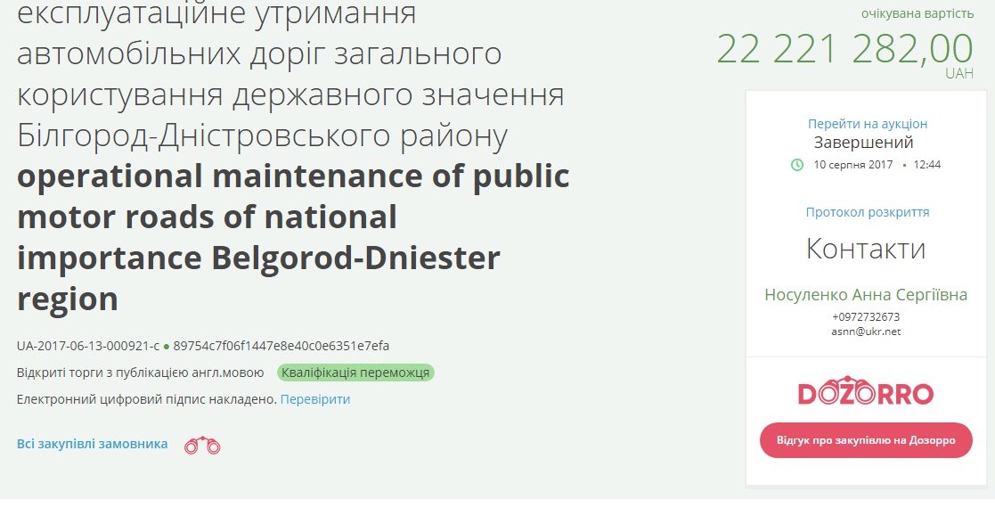 При ожидаемой стоимости закупки в 22 миллиона 221 тысячу гривень, «дочка» госавтодора согласилась работать за 20 миллионов 898 тысяч гривень