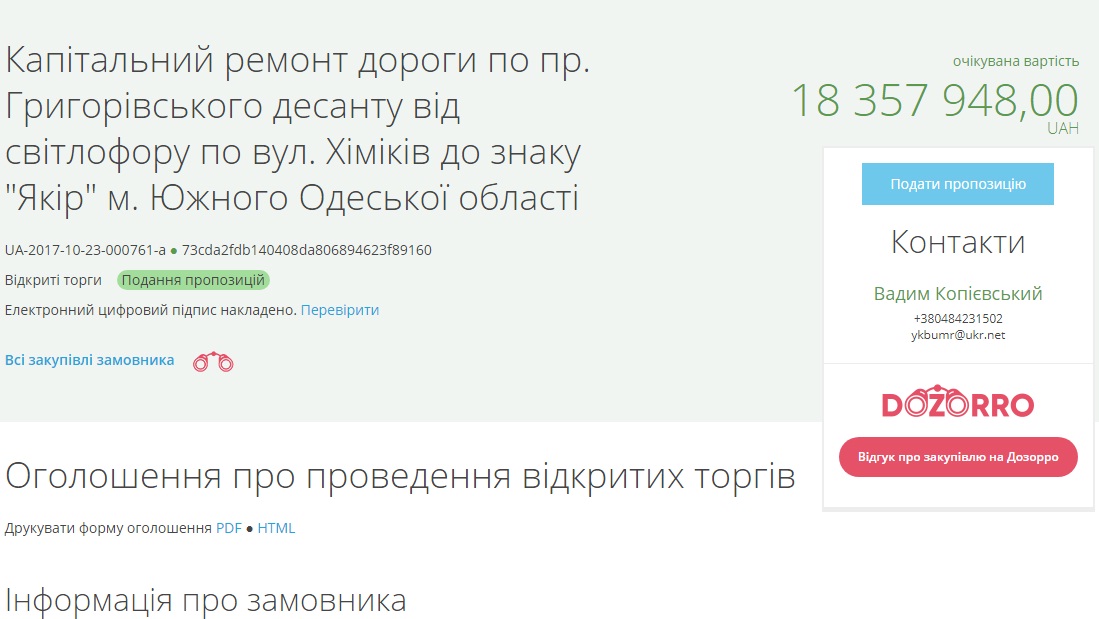 Управление капитального строительства Южненского городского совета объявило тендер для выбора компании, которой доверят ремонт участка проспекта Григорьевского десанта в Южном.