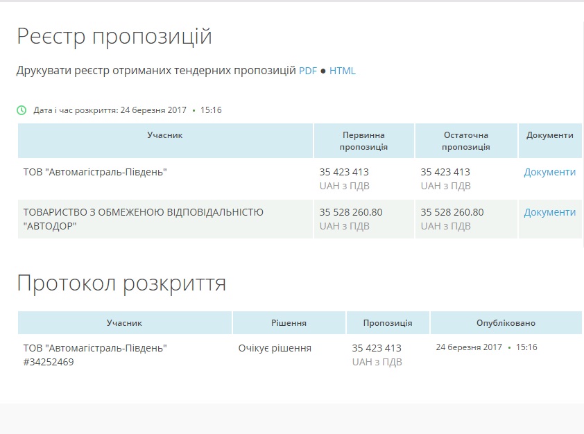 Единственным конкурентом ООО «Автомагистраль-Юг» выступило ООО «Автодор», которое соглашалось работать за 35 миллионов 528 тысяч 260 гривень.