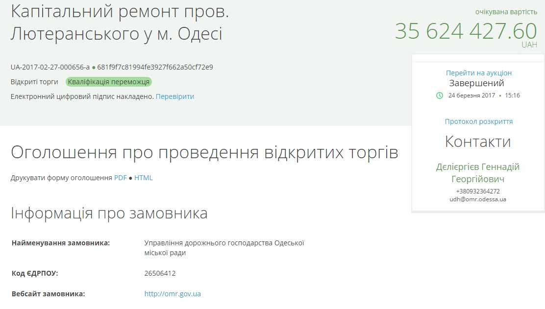 При ожидаемой стоимости закупки в 35 миллионов 624 тысячи 427 гривень, компания согласилась отремонтировать переулок за 35 миллионов 423 тысячи 413 гривень.