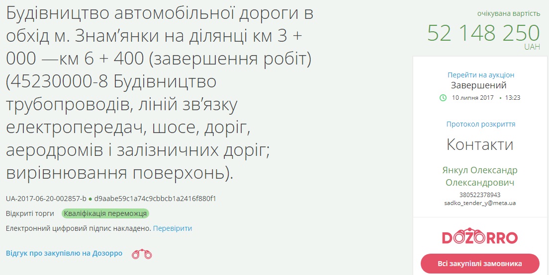 Тендерный комитет решил, что наиболее выгодным является предложение ООО «Ростдорстрой» согласившейся работать за 51 миллион 366,5 тысяч гривень, а ООО «Автодор» соглашалось работать за 51 миллион 470,3 тысяч гривень.