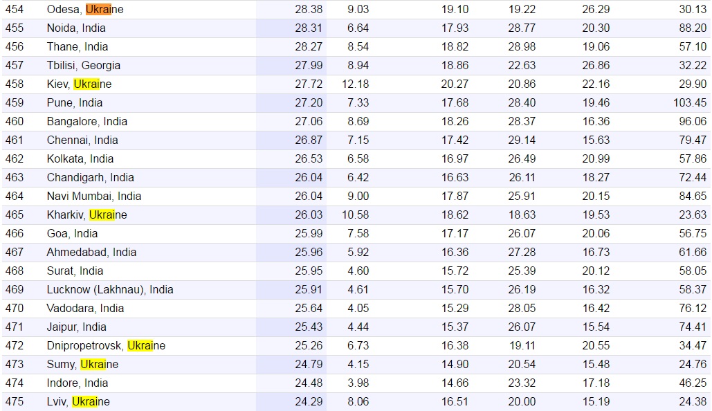На втором месте Киев – 458 место, третье - Харьков на 465 месте, Днепр, Суммы и Львов находятся на 472, 473 и 475 местах соответственно.