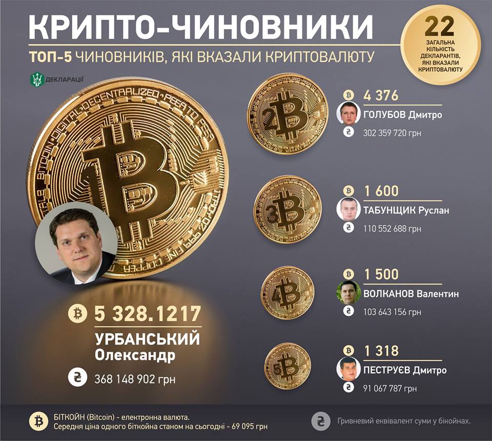 По данным аналитиков, криптовалюту в декларациях указали 22 политика и чиновника, однако первую пятерку прочно «оккупировали» одесситы. На первом месте - народный депутат Александр Урбанский («Блок Петра Порошенко «Солидарность») - брат председателя Одесского областного совета. Он хранит 5 тысяч 328.1217 биткоинов, что в пересчете на украинскую валюту составляет 368 миллионов 148 тысяч 902 гривни.