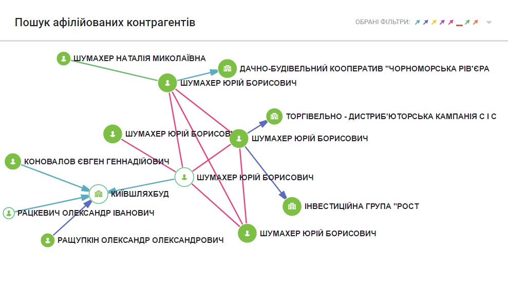 Согласно единому реестру юридических лиц, физических лиц-предпринимателей и общественных формирований, конечными бенефициарами ЧП «Киевшляхбуд» являются «Соер и Брантон ЛТД» зарегистрированная на Виргинских островах, а также Юрий Шумахер, Александр Рацкевич, Евгений Коновалов и житель Лондона Александр Жуков. Эти же люди числятся конечными бенефициарами ООО «Ростдорстрой». Юрий Шумахер является депутатом Одесского городского совета от партии «Доверяй делам» Геннадия Труханова.