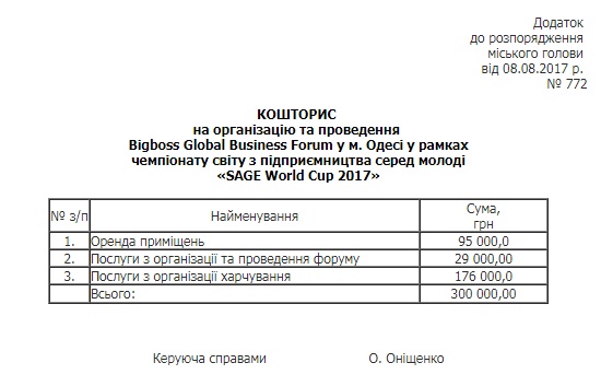 Городской голова Одессы Геннадий Труханов подписал распоряжение о выделении средств на на организацию и проведение Bigboss Global Business Forum в Одессе в рамках чемпионата мира по предпринимательству среди молодежи «SAGE World Cup 2017».