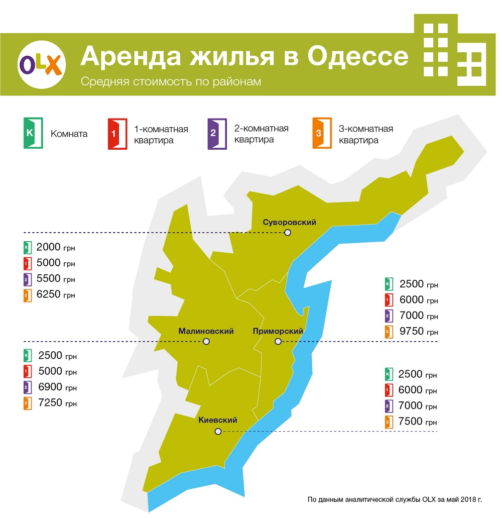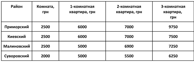 Недорогие «однушки» можно найти в Суворовском и Малиновском районах, где стоимость за месяц в среднем будет около 5 000 грн.