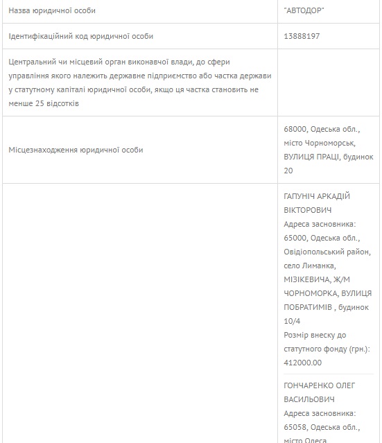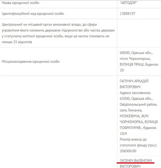 ООО «Автодор» интересно тем, что до недавнего времени наряду с Аркадием Гапуничем в число основателей входил Валентин Гапунич — депутат Одесского городского совета от парии «Доверяй делам» Геннадия Труханова, однако сейчас его имя в списке конечных бенефициаров фирмы отсутствует.
