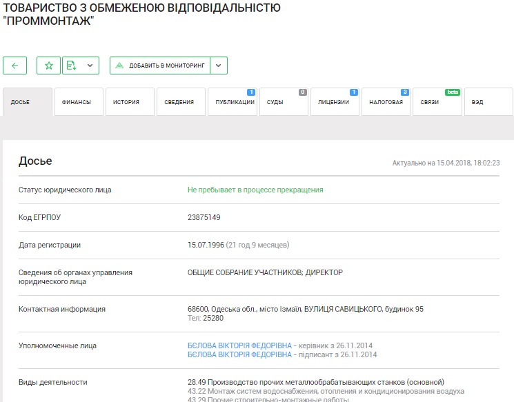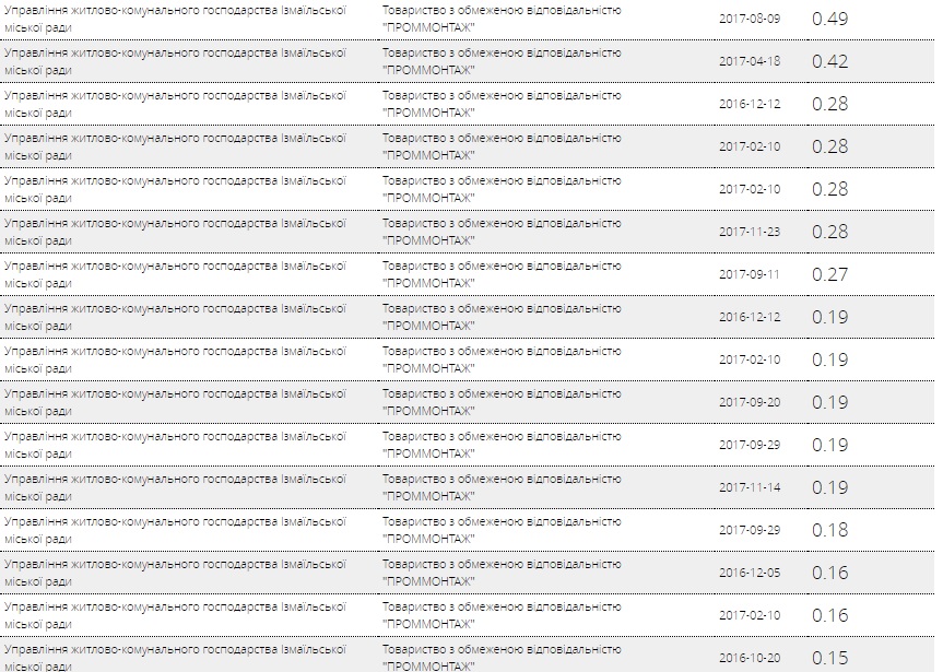 Интересно, что это предприятие постоянно выполняет различные ремонтные работы в сфере ЖКХ города, причем без конкурсных процедур, поскольку стоимость закупок не превышает установленную законодательством допороговую норму. Так, согласно данным системы z.texty.org.ua, только за 2016-2017 годы фирма получила из измаильского бюджета 5,19 млн грн по 20 договорам. При этом 17 из них были заключены с управлением жилищно-коммунального хозяйства Измаильского горсовета, один – с исполкомом и два – с коммунальным историко-краеведческим музеем Придунавья.