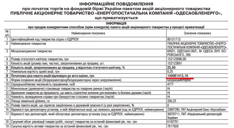 Напомним, 15 августа 2017 года были запланированы торги по продаже 25% акций ОАО «Одессаоблэнерго» со стартовой ценой - 631 миллион 300 тысяч гривень, но они сорвались, так как ни одна компания не подала заявок на участие в торгах.