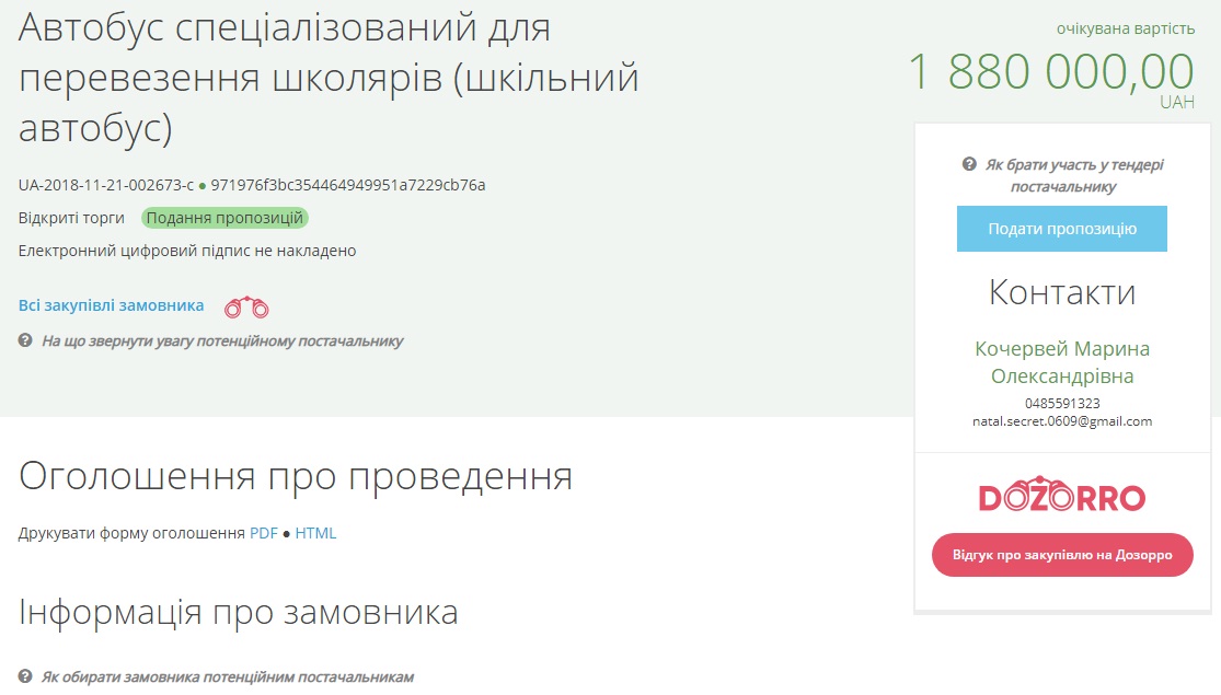 Соответствующие данные опубликованы в системе электронных закупок Рrozorro.