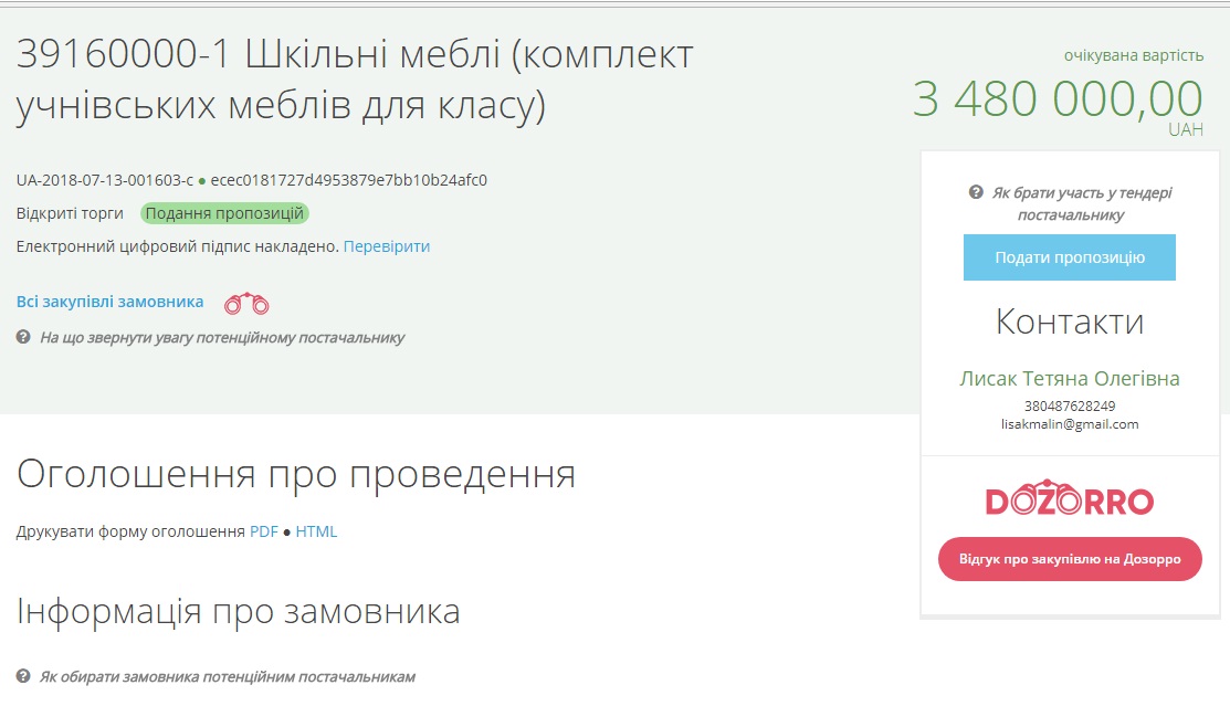 Соответствующее объявление о тендере опубликовано в системе электронных закупок Рrozorro.