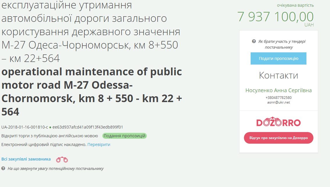 Служба автомобильных дорог объявила тендер для поиска компании, которой заплатят за эксплуатационное содержание участка автомобильной дороги общего пользования государственного значения М-27 Одесса-Черноморск