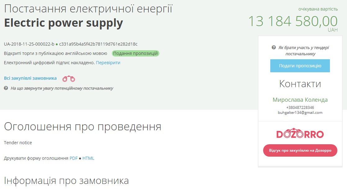 Соответствующая информация опубликована в системе электронных закупок Рrozorro.