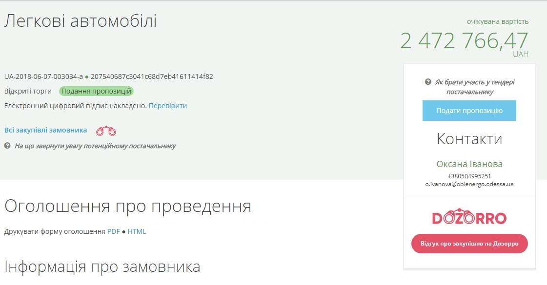 Акционерное общество «Одессаоблэнерго» намерено купить легковые автомобили за 2 миллиона 472 тысячи 766 гривень.