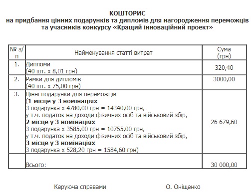Согласно смете, 320 гривень планируют потратить на покупку 40 дипломов и три тысячи гривень - на рамки к ним.