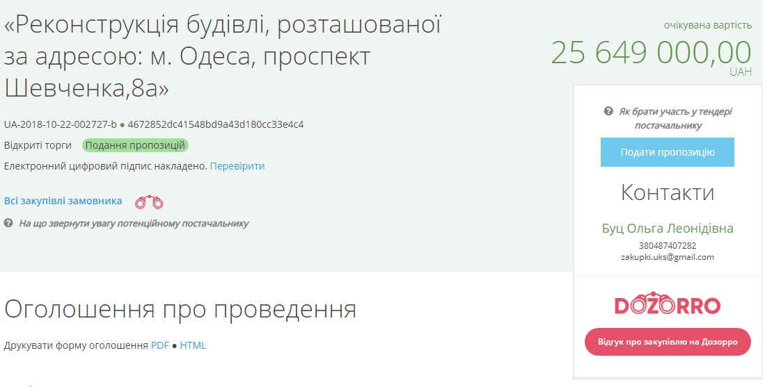 Ожидаемая стоимость закупки 25 миллионов 649 тысяч гривень. Работы компания-победитель должна будет закончить до 31 ноября 2019 года.
