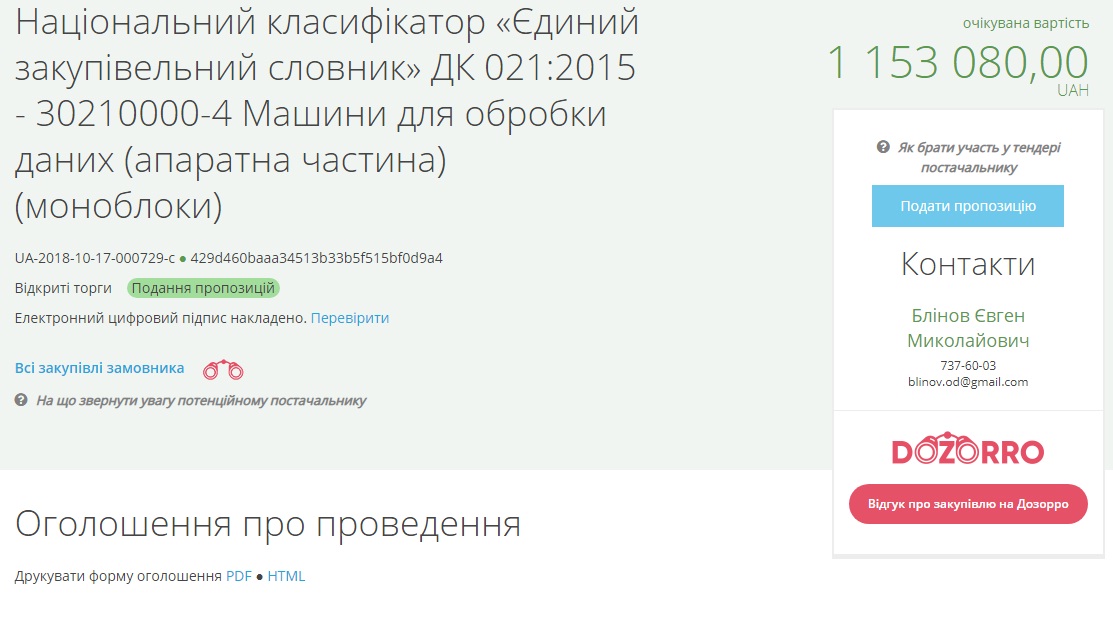 Согласно системе аукцион состоится 5 ноября, а за работу заплатят 1 миллион 153 тысячи гривень. Поставка товара ожидается до 14 декабря текущего года.