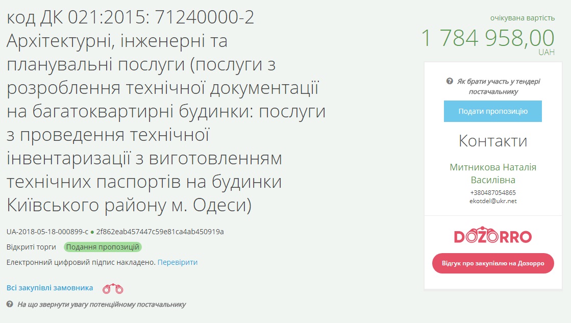 Управление городского хозяйства Одесского городского совета объявило тендер для поиска компании, которой заплатят за услуги по разработке технической документации на многоквартирные дома и проведение технической инвентаризации с изготовлением технических паспортов на дома Киевского района Одессы.