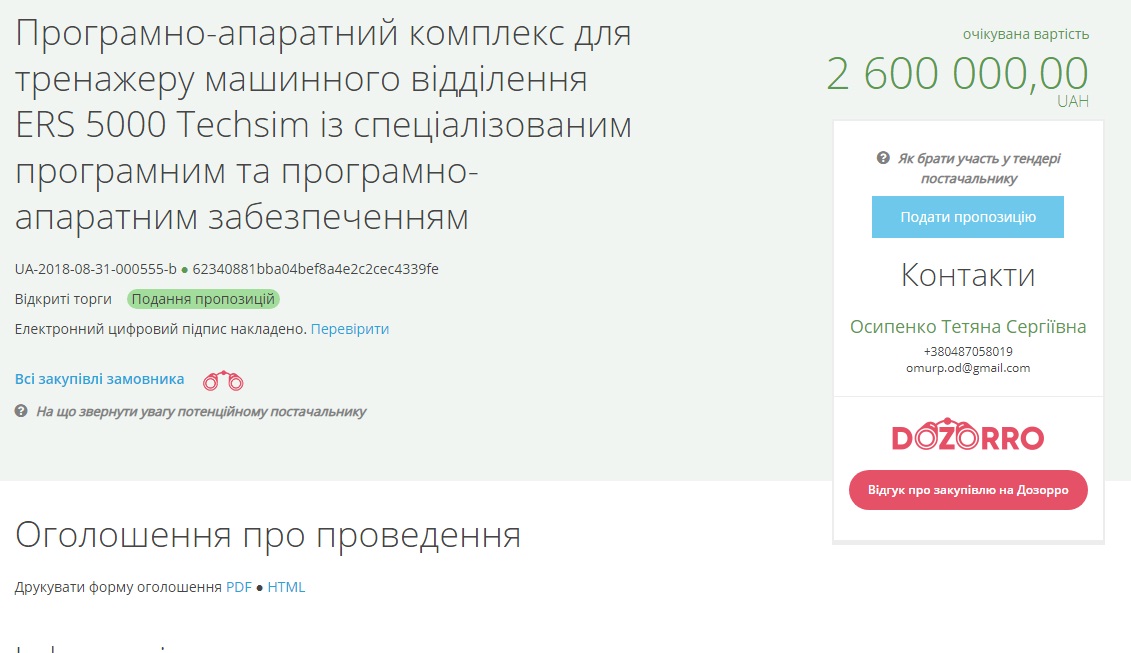 Соответствующее объявление опубликовано в системе электронных закупок Рrozorro.