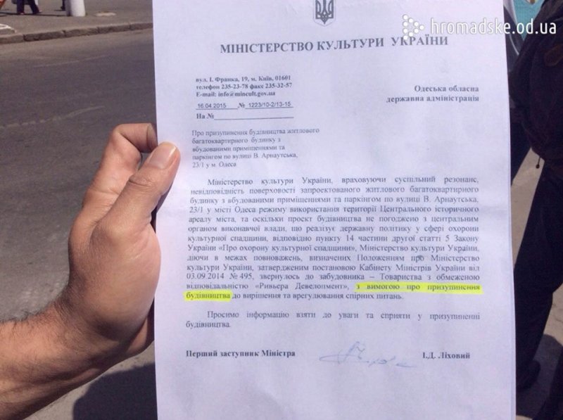 Отметим, что в 2015 году Министерство культуры, учитывая общественный резонанс, вызванный строительством высотки в историческом центре Одессы, обратилось к застройщику - ООО "Ривьера Девелопмент" - с требованием приостановить работы до решения спорных вопросов.