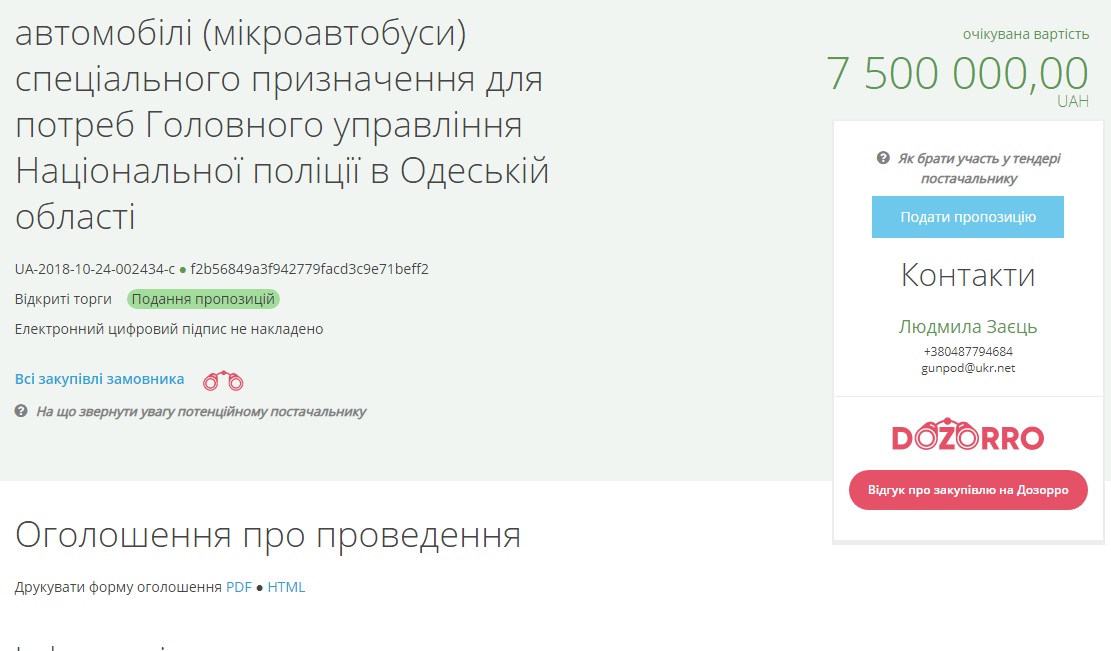 Главное управление Национальной полиции в Одесской области объявило тендер для приобретения восьми микроавтобусов.